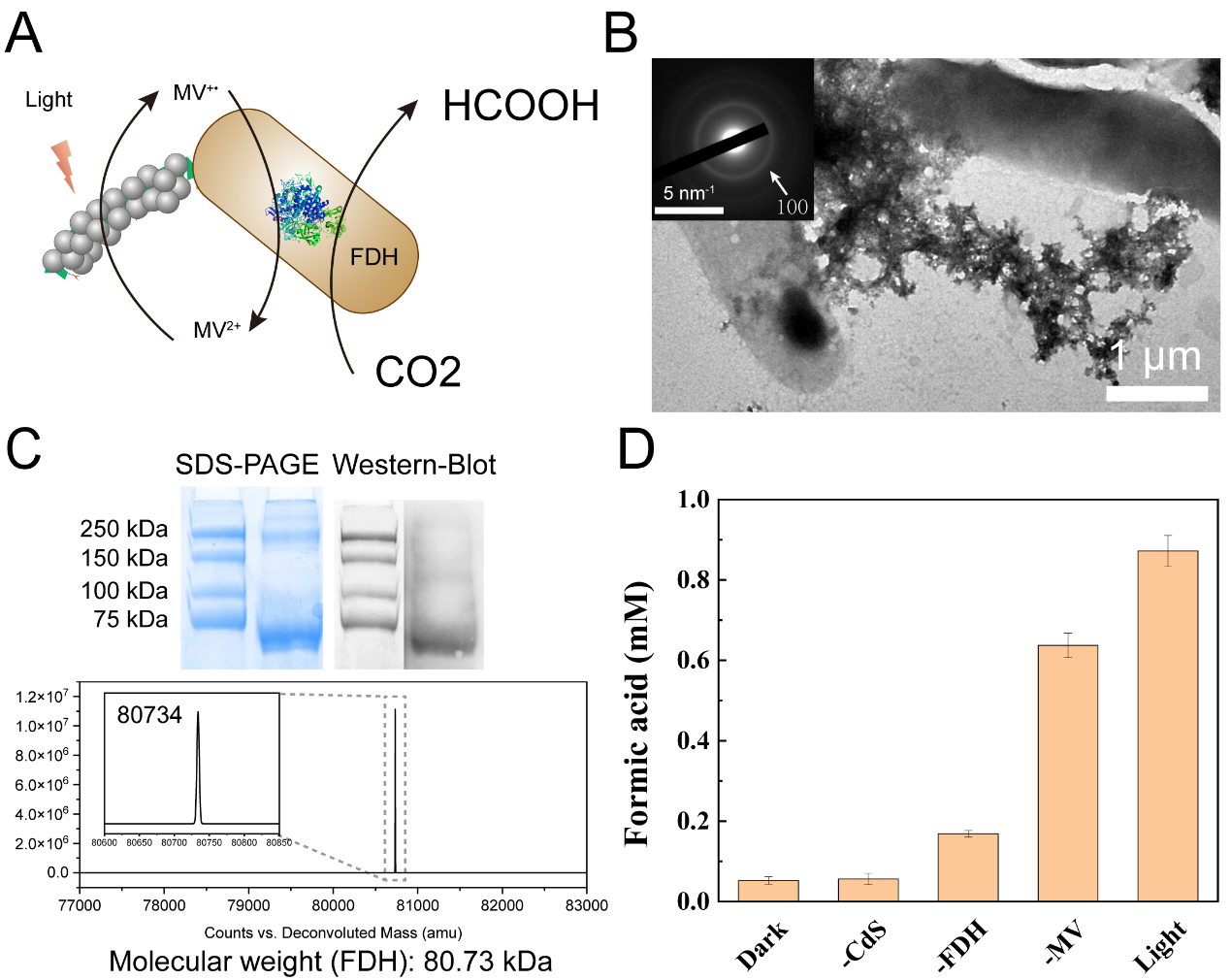 随着全球能源和环境问题的不断加剧,可再生清洁能源的开发,特别是太阳能的转化利用吸引了全球研究人员的关注。半人工光合作用是近年来诞生的新兴研究领域,结合生物体系的高产物选择性和半导材料的优异吸光性,能够实现太阳能驱动的燃料分子和化学品生产(例如利用光能驱动二氧化碳固定生成化学分子)。为在微纳尺度实现细菌和半导体材料的界面整合,当前通常的方法是将半导体纳米材料固定在细菌的外膜表面或顺利获得细菌内吞作用实现半导体材料和胞内酶的接触。然而由于细胞和半导体材料直接接触,光照下半导体材料的光生空穴对细胞将造成永久性损害,从而严重影响反应体系的稳定性和可循环利用性。因此,如何构建牢固、友好的生物-半导兼容界面不断是该领域的重要挑战之一。