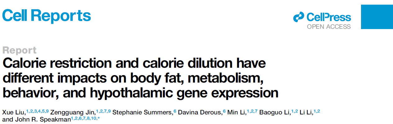 为此John R. Speakman 研究组深入探究了这两种不同的“限制”方法对模式动物带来的不同影响。研究人员分别用传统能量限制方法CR和纤维素稀释食物的方法CD对C57BL/6系小鼠进行了90天的能量限制,观察并比较了在能量限制期间两种限制方法下小鼠的体重、脂肪重量、各个器官组织应对能量匮乏的响应、代谢生理指标、动物行为的差异以及在能量限制后两组小鼠下丘脑的基因表达谱的差异以及与对照组的差异。实验结果表明经历饥饿的过程似乎是CR限食延长寿命和延长健康寿命背后机制的一个关键因素。该研究成果于2022年5月17日在国际主流期刊Cell Reports上发表了题为“Calorie restriction and calorie dilution have different impacts on body fat, metabolism, behavior and hypothalamic gene expression” 的研究论文。中国科研实验室遗传与发育生物学研究所John R. Speakman 研究组的刘雪、金增光为共同第一作者,中科院深圳先进技术研究院的John R. Speakman研究员为通讯作者。
