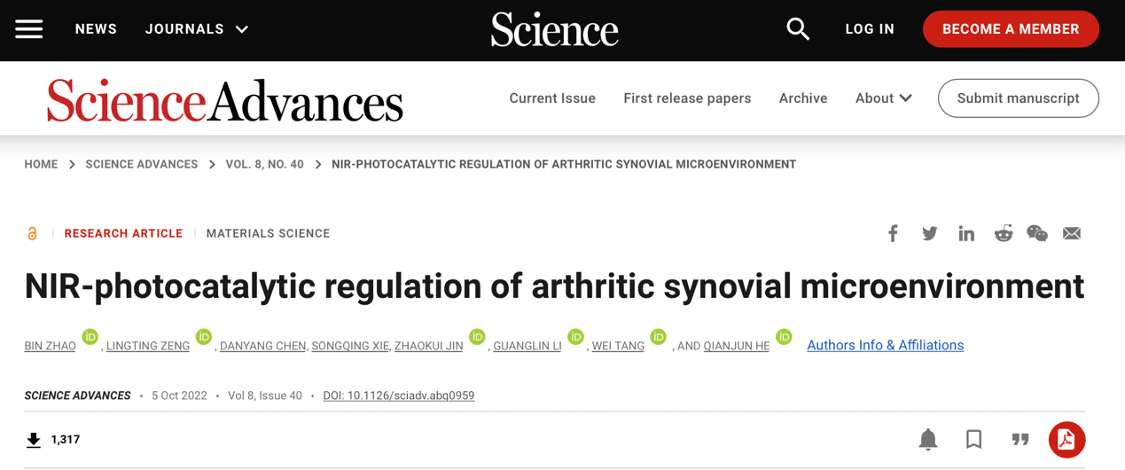 Science Advances |光催化调控关节炎滑膜微环境研究