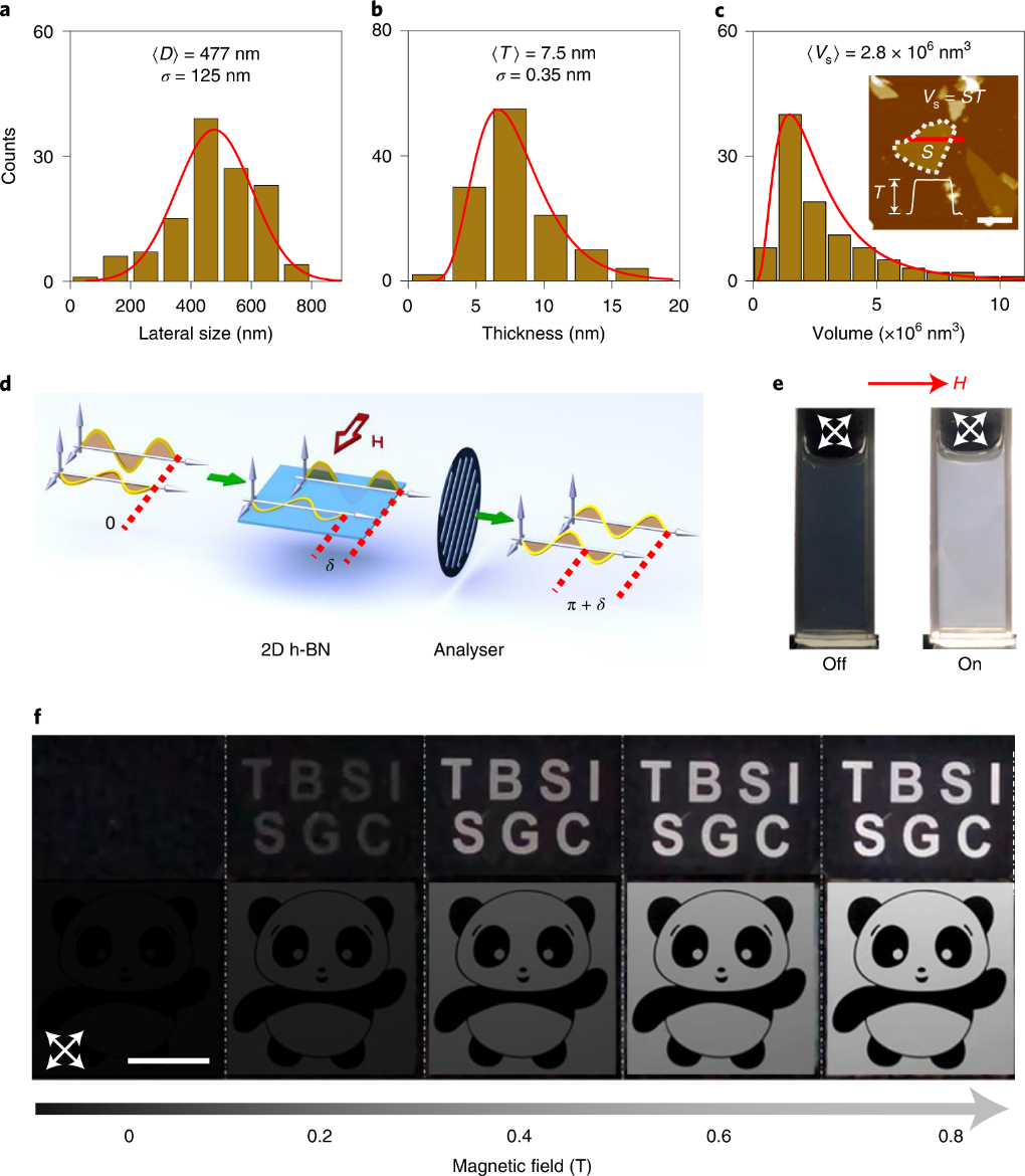 基于上述考虑,团队成员研制出了一种基于二维六方氮化硼无机液晶的磁光调制器,采用的氮化硼二维材料具有极大的光学各向异性因子(6.5 × 10-12C2J-1m-1)、巨比磁光克顿-穆顿系数(8.0 × 106T-2m-1)、高循环工作稳定性(270次循环工作后性能保留率高达99.7%)和超宽带隙等优点。所研究的二维六方氮化硼是顺利获得 “自上而下”的高粘度纯溶剂辅助研磨法剥离制备而成。由于其超宽的带隙,二维六方氮化硼液晶在可见、紫外和部分深紫外光谱区具有极高透明度。在磁场作用下,基于二维六方氮化硼液晶的磁光器件在正交偏振片下呈现了明显的磁控光开关效应。