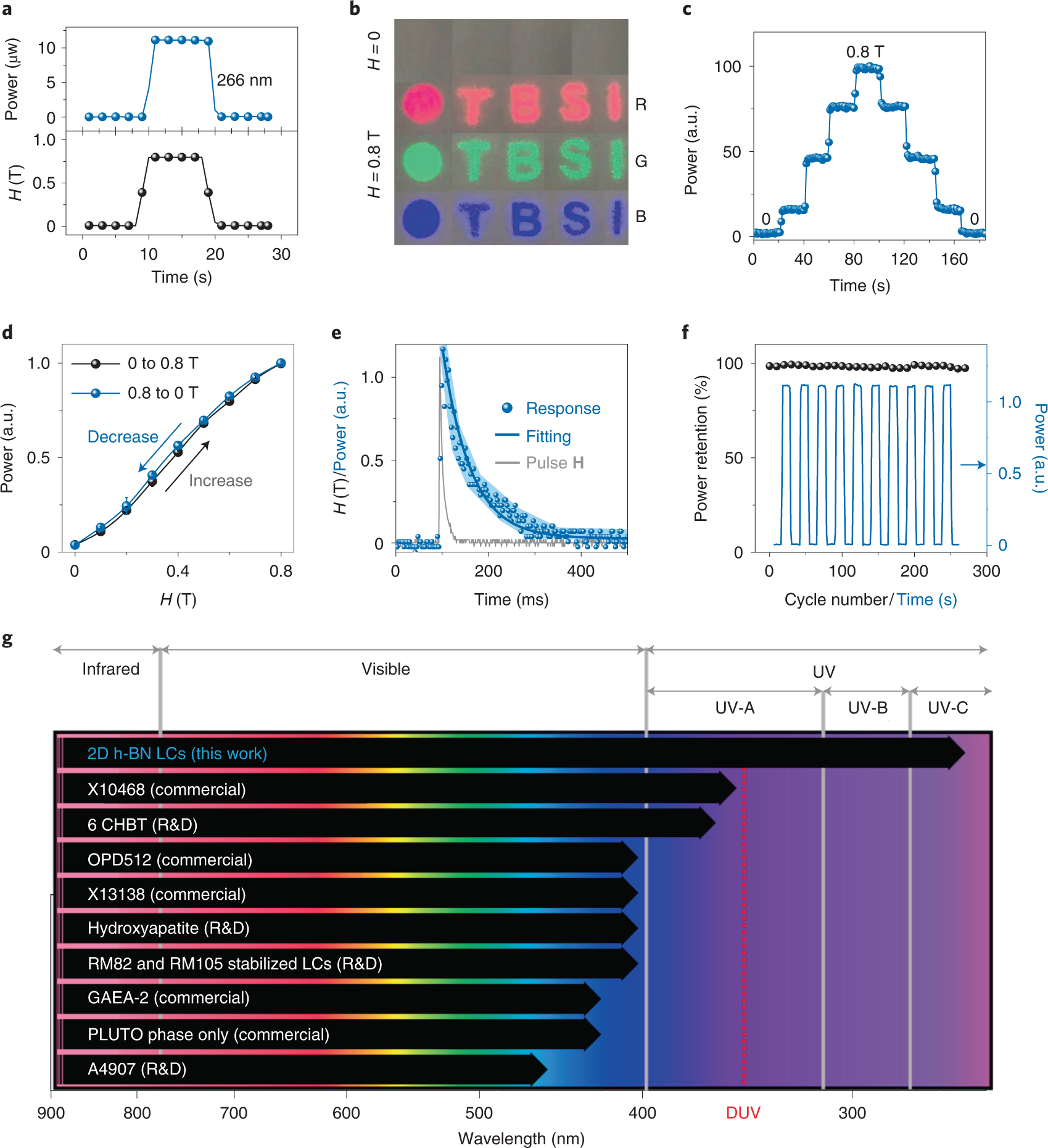 该团队选用波长处于深紫外UV-C日盲区的266 nm激光,测试二维氮化硼液晶在该光谱区的光学调制性能。顺利获得开启和关闭0.8 特斯拉的磁场,实现了该调制器在深紫外光波段的透明与不透明两种状态之间的切换。经过270个不间断开关循环测试后,性能的保持率高达99.7%。