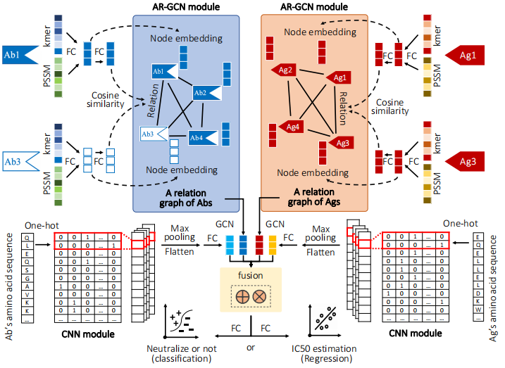 抗原是侵入机体的外来物质,包括细菌、病毒等。 抗体是机体在抗原刺激下,由B细胞分化成的浆细胞所产生的、可与抗原发生特异性结合反应的免疫球蛋白。抗体对抗原的高特异性和高亲和力使得抗体药具有靶向性强、副作用小和疗效显著等优点,因而在疾病的诊断和治疗中显示出其他类型药物无可比拟的优势,是治疗包括癌症及自身免疫性疾病在内的重要药物。人体在病毒刺激下可产生约1020种抗体,加上人工合成的抗体,未知抗体空间巨大。然而,其中仅仅很小一部分抗体对特定抗原起作用。用湿实验来筛选能中和抗原的抗体耗时耗力,开发快速筛查中和抗体的计算方法十分必要。