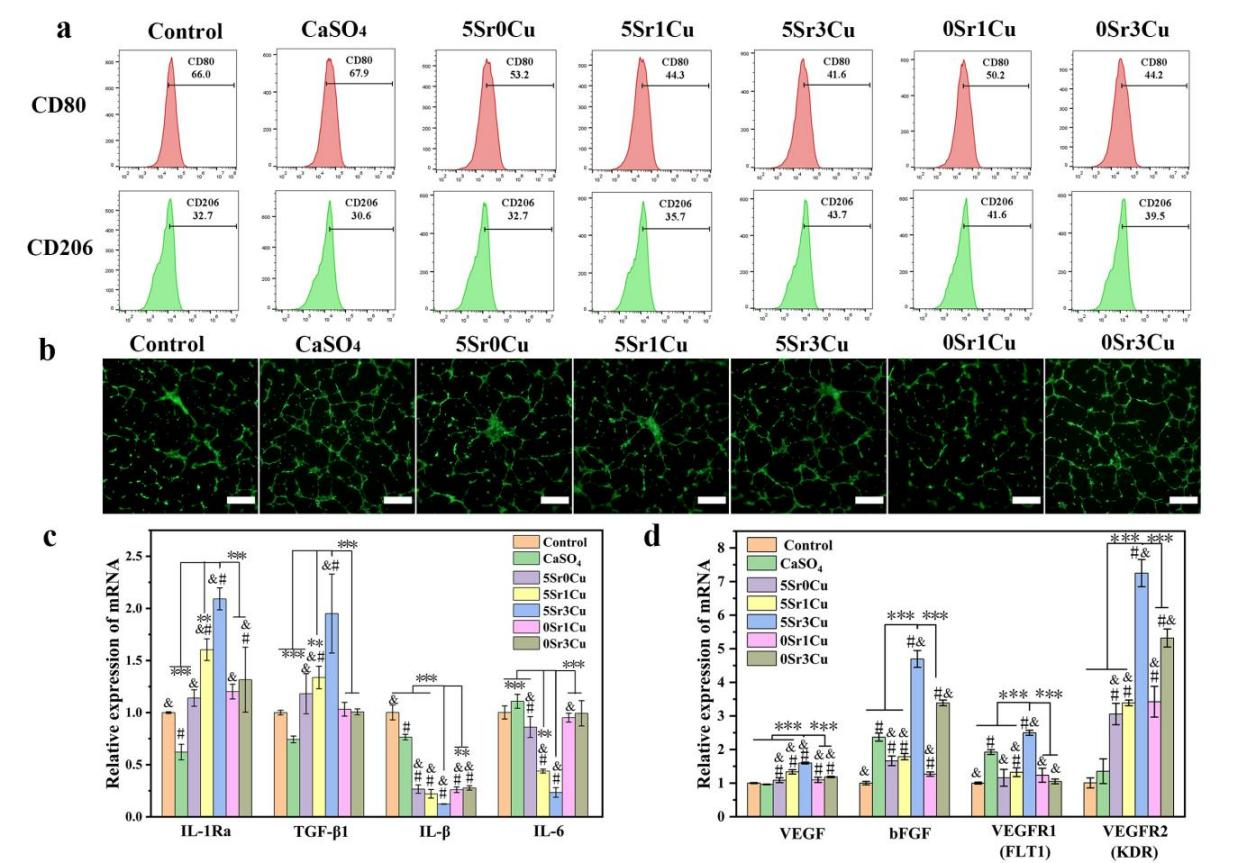 图2 Sr/Cu-BSG骨水泥体外免疫调控和成血管性能
