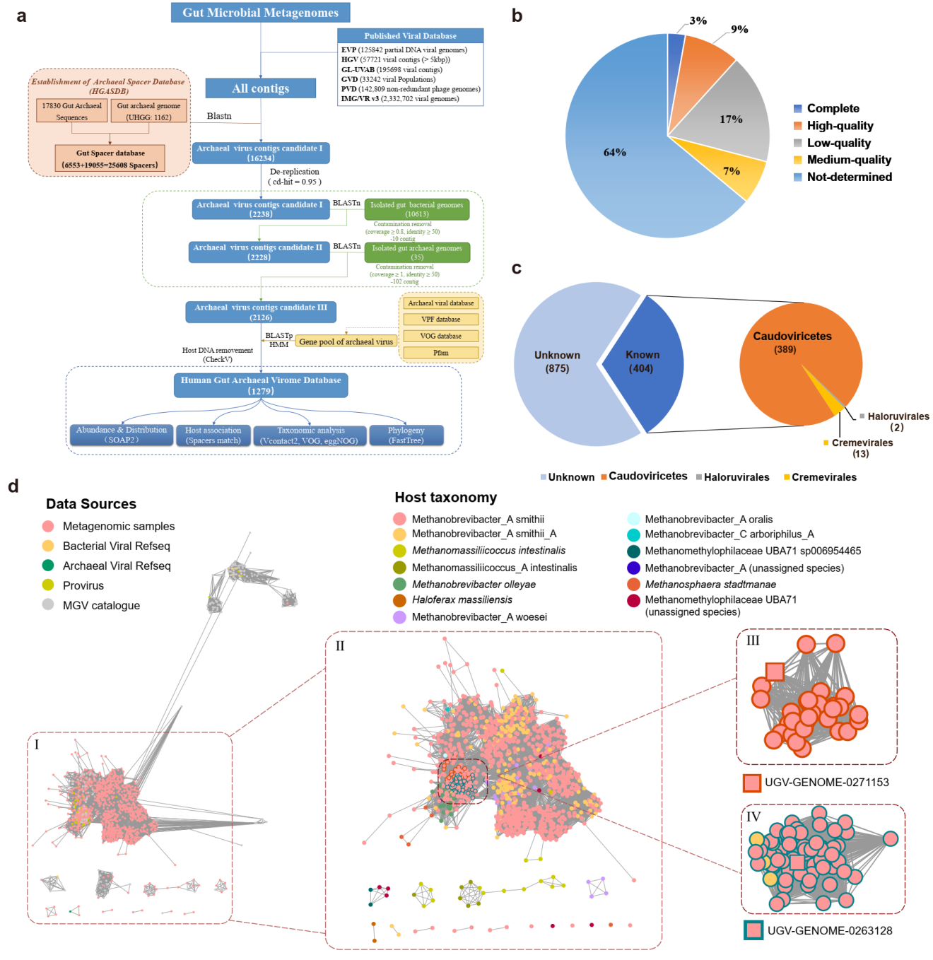 研究表明约有90%古菌基因组包含CRISPR结构1, 因此CRISPR spacer-protospacer的匹配分析适用于古菌病毒序列的识别。为了对人类肠道中的古菌病毒进行全面搜索,团队第一时间构建了人类肠道相关古菌spacer序列数据库 (HGASDB, Human Gut Associated Archaeal Spacer Database),并基于HGASDB和古菌病毒的特征基因构建了一套肠道古菌病毒的鉴定方法,从收集的2271个肠道宏基因组样品中及6个公开的病毒数据库中共鉴定出了1279种古菌病毒,构成人类肠道古菌病毒组数据库 (HGAVD) (图1a)。随后,团队对鉴定出的病毒代表序列进行质量评估,大多数 (67%) 病毒contigs的质量无法得到评估。与此同时,团队基于对病毒序列的网络分析以及病毒蛋白序列的注释信息,对HGAVD中的病毒序列进行了分类学的分析,其中大部分序列 (68.4%) 无法被分类到任何已知的病毒类别,这些分析表明人类肠道中依然存在大量未知的古菌病毒。此外,团队还将HGAVD中的病毒与公共的肠道病毒数据库进行了比较(图1d),发现来自HGAVD的大多数病毒 (n=1,097; 86%) 均无法与公共数据库中的病毒聚类到一起,这表明HGAVD对肠道古菌病毒组具有良好的代表作用。综上所述,HGAVD极大地扩展了人类肠道中古菌病毒多样性。