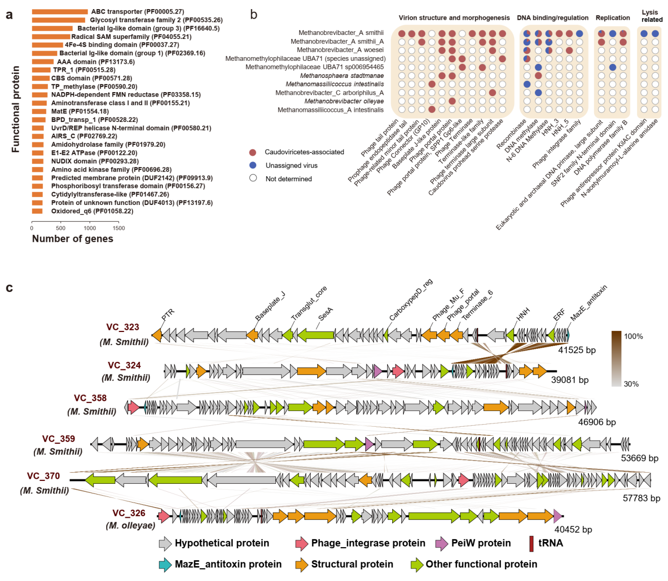 虽然人类肠道中古菌的功能蛋白已被广泛研究,但是对于肠道内古菌病毒蛋白的理解却十分有限。为此,团队从1279条古菌病毒代表序列上共预测出了97,208个编码蛋白的基因,分别仅有 10.8%和 17.4% 的基因能够与pVOG3数据库及PHROG4数据库中的基因相匹配,表明人们现在对人类肠道古菌病毒的潜在功能知之甚少 (图4a)。