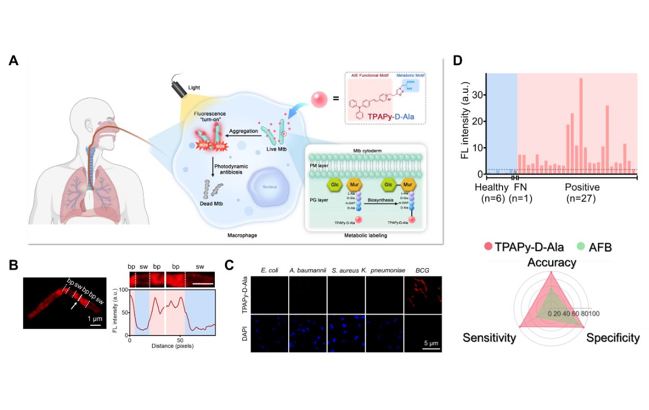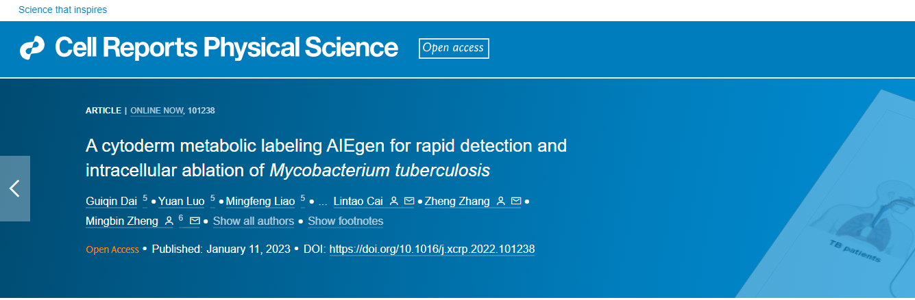 近期,中国科研实验室深圳先进技术研究院蔡林涛研究员团队与深圳市第三人民医院(国家感染性疾病临床医学研究中心)合作,在Cell Press旗下新期刊Cell Reports Physical Science发表了题为 “Cytoderm Metabolic Labeling AIEgen for Rapid Detection and Intracellular Ablation of Mycobacterium Tuberculosis”的文章。基于点击化学技术,团队构建了菌壁代谢标记型聚集诱导发光探针(AIEgen),参与结核分枝杆菌菌壁肽聚糖的生物合成。免洗的 AIEgen 可快速(10 分钟)和选择性地对活 Mtb 进行代谢标记,与金标准抗酸染色相比,AIEgen代谢标记检测的灵敏度提高了50倍。