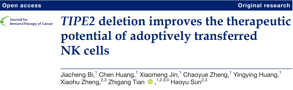 2月1日,肿瘤免疫治疗学会(SITC,Society for Immunotherapy of Cancer)的官方杂志Journal for ImmunoTherapy of Cancer在线发表了田志刚课题组的最新研究成果”TIPE2 deletion improves the therapeutic potential of adoptively transferred NK cells”,报道了在肿瘤微环境的NK细胞中TIPE2分子的表达水平与NK细胞的功能耗竭状态相关,顺利获得CRISPR/Cas9技术敲除TIPE2阻滞了NK细胞耗竭状态并显著增强过继NK细胞的抗肿瘤效应,表明靶向敲除TIPE2是促进NK细胞免疫治疗的潜在策略。