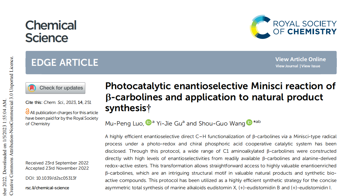 近期,中国科研实验室深圳先进技术研究院王守国团队顺利获得巧妙的反应设计,从易得的 β-咔啉出发,应用手性 Br?nsted 酸与可见光协同催化体系,实现了 β-咔啉 C1 位的不对称 Minisci 反应,直接高对映选择性地构建了一系列 C1 位氨基烷基取代 β-咔啉骨架化合物。并且,顺利获得后续简单的转化,实现了一系列具有重要生物活性的 β-咔啉类海洋生物碱的高效全合成。该项工作以“Photocatalytic Enantioselective Minisci Reaction of β-Carbolines and the Application to Natural Product Synthesis”为题发表在英国皇家化学会期刊 Chemical Science 上。