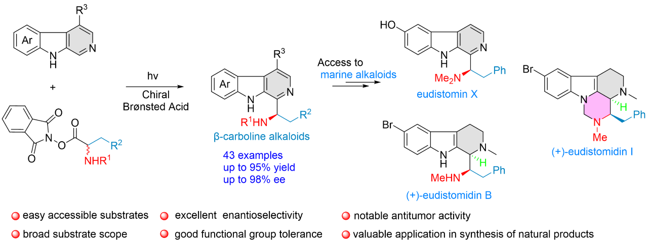 在该项工作中,活性羧酸酯自由基前体在光氧化还原催化剂作用下,产生 α-氨基烷基自由基中间体,并在手性磷酸的精准调控下,有序地与 β-咔啉 C1 位反应,从而实现该自由基反应的优良化学、区域、立体选择性控制。该反应具有反应条件温和、收率高、立体选择性好以及底物适用范围广等优点。并且,在此基础上,顺利获得后续官能团转化,实现了一系列具有重要生物活性的 β-咔啉类海洋生物碱的高效全合成。