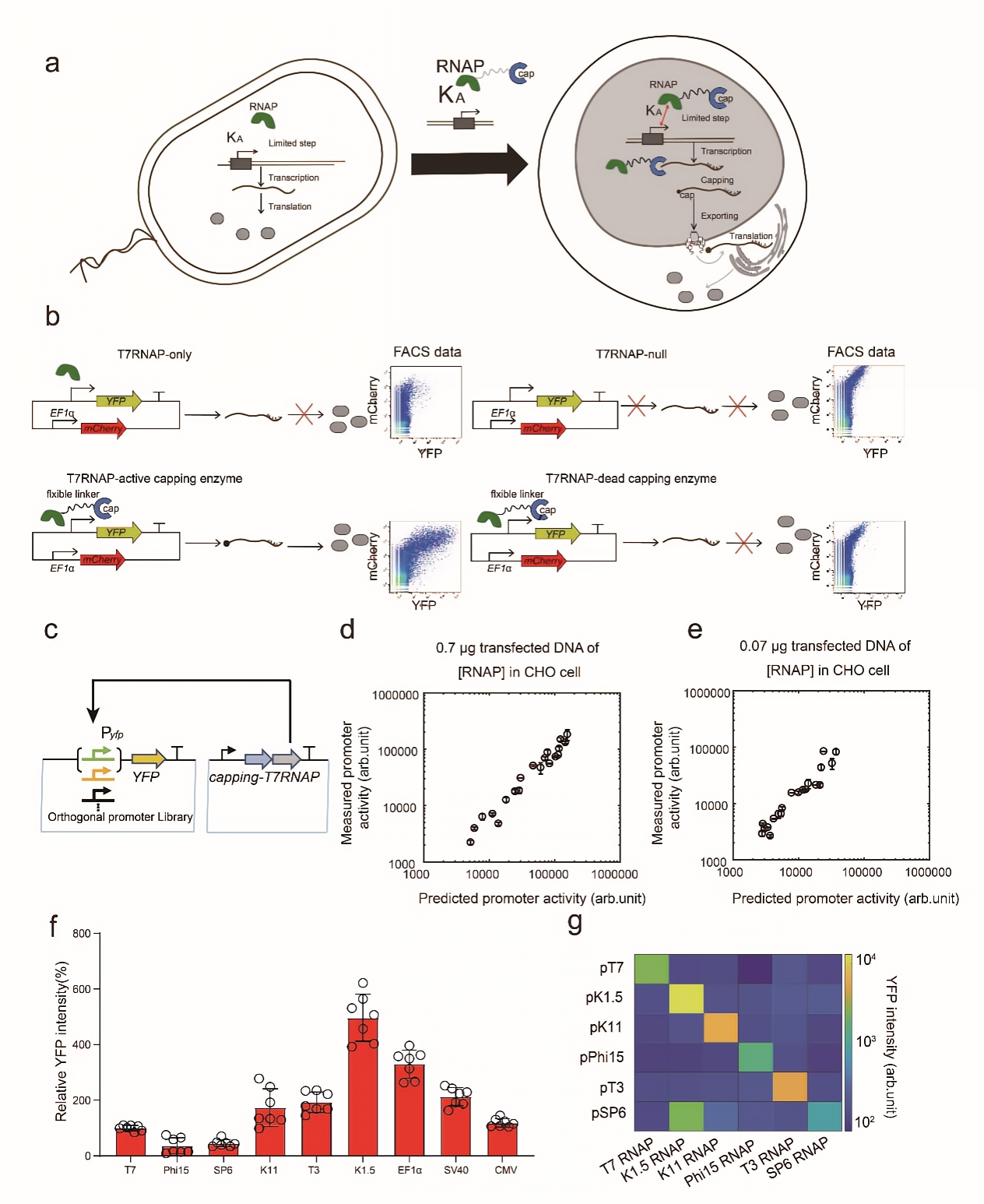 本文提出一种设计策略,旨在开发一种模块化、独立于宿主的正交型转录系统。该正交型转录系统由正交型启动子库和单体RNA聚合酶(RNAP)组成。该系统顺利获得将RNA加帽酶与单体RNAP融合,可确保原核来源的单体RNAP在哺乳动物细胞中按照“跨域(domain)”方式实现基因转录、转录后修饰、出核和翻译等真核系统蛋白质表达的必需步骤(图1)。