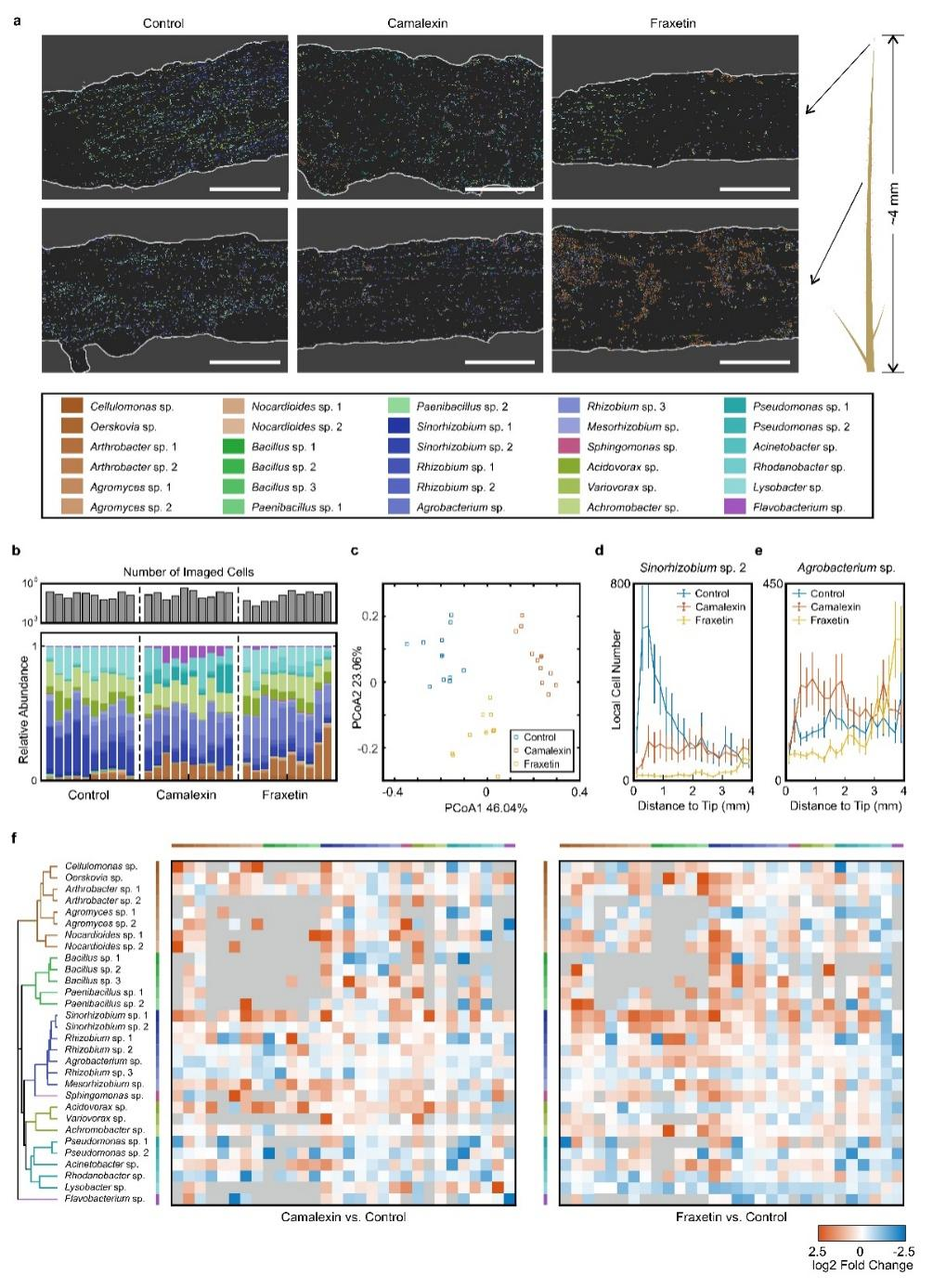 顺利获得外源添加拟南芥根际分泌的代谢产物植保素(camalexin)和香豆素(fraxetin),研究团队发现根际微生物的组成和空间分布都发生了显著的变化(图4a-c)。比如,中华根瘤菌主要定植于靠近根尖的位置,而这种偏好性的定植在加入植保素和香豆素后发生了改变(图4d)。农杆菌本身在根上的定植没有偏好性,但在受到香豆素扰动后表现出更多的定植于根成熟区(图4e)。根际微生物空间分布的高度异质性和物种之间的差异,与环境异质性、微生物本身的特性都有关。进一步对定植微生物的空间关联进行分析,发现植保素和香豆素都不同程度地影响改变了物种之间的空间关联(图4f)。微米尺度下的空间关联暗示了微生物群落中不同物种之间广泛存在的短程相互作用 (如营养竞争与互养、接触抑制、群体感应等),对于进一步的机制研究有重要的指导意义。