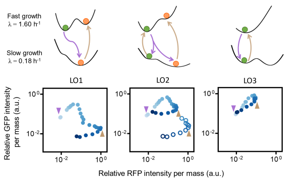 为了研究细胞的生长速率对基因网络是否可以存在影响,科研团队利用了经典合成基因线路——拨动开关线路(the toggle switch1),来研究这种可能性。拨动开关线路由两个相互阻遏的基因所构成,使得该线路在稳态(stable states)下只能存在一种基因处于高表达状态。这样的网络拓扑结构也广泛存在于自然界中,例如:λ噬菌体溶菌-溶原决定,线虫左右味觉神经分化。另外,构成这一线路的元件已经被广泛定量表征,与宿主自生基因调控网络相正交,因此可以排除宿主自身状态对基因线路的直接调控,同时也利于定量分析网络的稳态行为。