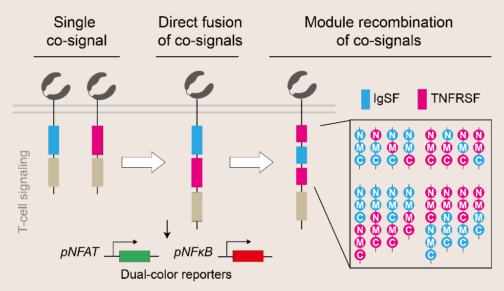 研究团队顺利获得并运用合成生物学手段从天然的共刺激受体中定义功能模块,顺利获得蛋白质模块重组的方法,设计了一系列新型共刺激结构域,从而取得了大量嵌合抗原受体。顺利获得在Jurkat细胞系中构建的基于荧光蛋白的NFAT(Nuclear Factor of Activated T cells)和NF-κB(Nuclear Factor kappa-light-chain-enhancer of activated B cells)信号通路的双报告系统,建立了定量表征T细胞信号特征的高通量平台,从信号通路和作用机制层面,为鉴定和预测嵌合抗原受体的活性给予了有效的技术手段。与此同时,该项目顺利获得人工重组取得的嵌合抗原受体大多具有激活T细胞的活性,且NFAT和NF-κB信号通路的响应程度相差较大,极大的扩展了嵌合抗原受体对T细胞的激活强度范围。研究发现,NFAT和NF-κB信号通路的活跃程度与CAR-T细胞的功能和命运呈现一定的关联性。