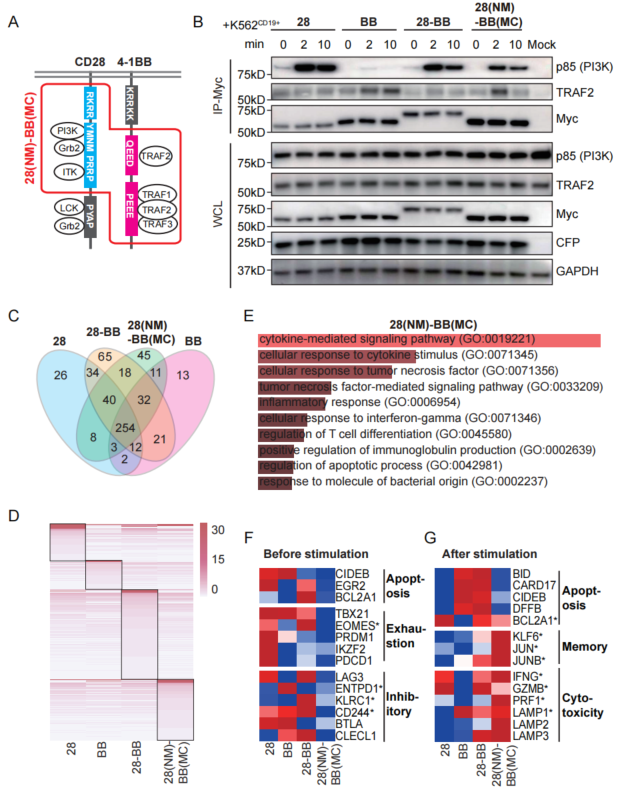 进一步研究结果显示,重组得到的28(NM)-BB(MC) CAR具有综合CD28和4-1BB特征的信号激活方式,呈现低本底激活、高响应强度的特征。研究人员进一步阐释这一信号特征对T细胞所带来的功能、命运的影响,将其应用在anti-CD19(α-CD19)和anti-mesothelin(α-meso)CAR-T细胞中,顺利获得体外细胞水平的实验,证明该种细胞在具有特异性杀伤靶细胞的能力的基础上,取得了和4-1BB类似的阻碍细胞耗竭的功能,还表现出降低T细胞的凋亡和细胞因子分泌的特点。转录组学的研究结果进一步揭示了28(NM)-BB(MC)在促进T细胞发挥杀伤功能、抑制耗竭和凋亡等方面所具有的优势。这些结果都说明重组型共刺激结构域有望为增强CAR-T细胞疗法的安全性和有效性给予可能。
