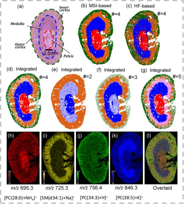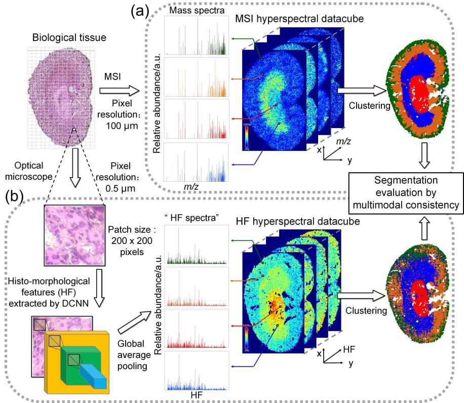 基于多模态融合方法的自动组织分区流程图:(a) 基于MSI数据的分支;(b) 基于H&E染色组织图像的分支 (以肾样本为例)