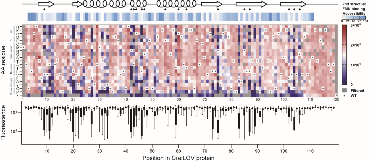 在本研究中,作者以来源于莱茵衣藻的CreiLOV为研究对象,采用NNK简并密码子构建了118个位点的单位点饱和突变文库(理论库容2360)。为了取得序列-荧光强度数据,利用荧光激活细胞分选测序(FACS-seq)及表型估计方法快速表征,顺利获得过滤的2185个突变序列占理论库容的92%以上。作者还对多种表型估计方法进行了比较,结果表明采用简单加权平均法各生物学重复相关性及估计与测量值相关性最高,其次为基于Gamma分布和正态分布的最大似然估计。根据序列-荧光强度数据,作者鉴定了减弱或增强CreiLOV荧光强度的关键位点、区域和氨基酸突变(图1)。