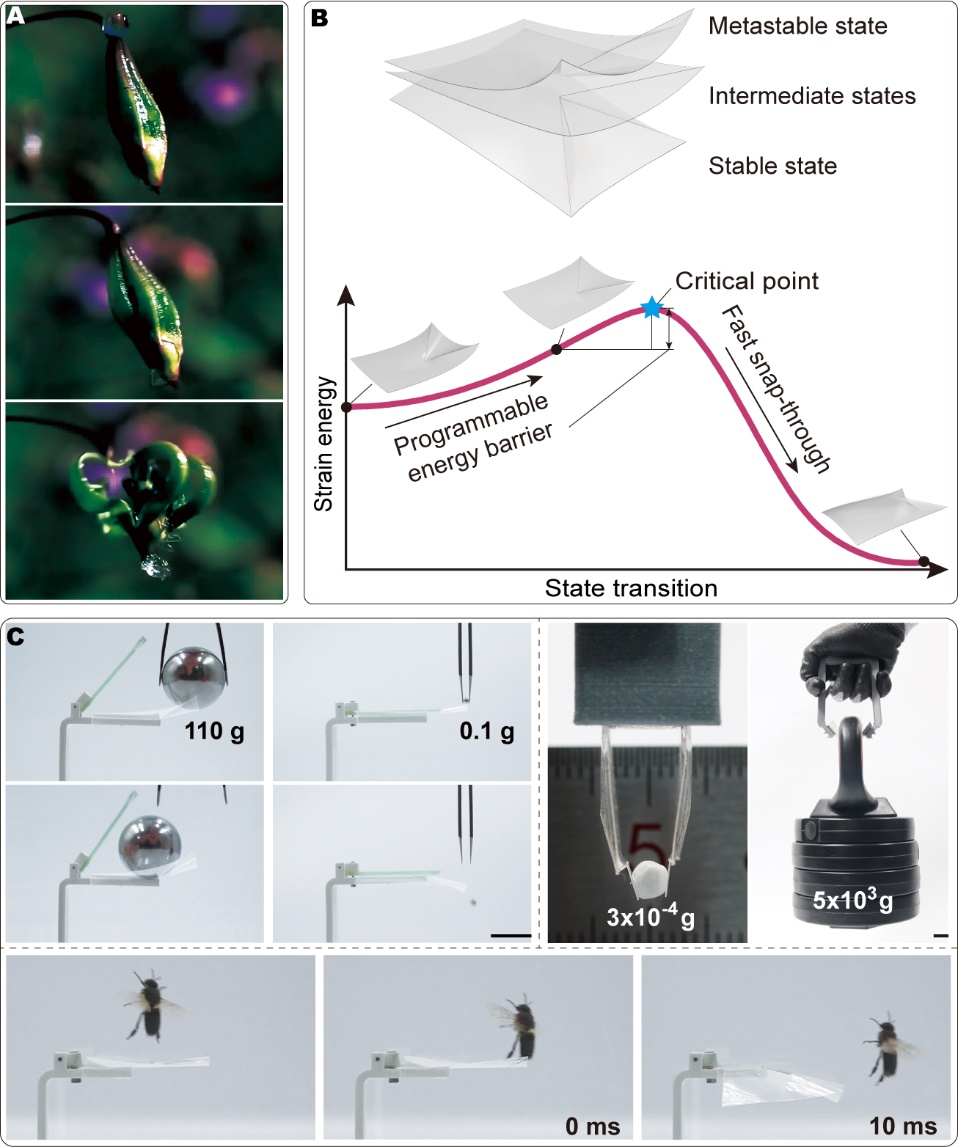 双稳态结构具有快速响应和力放大能力。利用稳态特性和不稳定性来快速释放双稳态结构中存储的能量可以提升机器人的诸多性能,例如高速运动、自适应传感和快速抓取等。然而,现在关于双稳态结构的研究主要集中在它们的稳定状态,却缺少对于他们中间状态的研究。