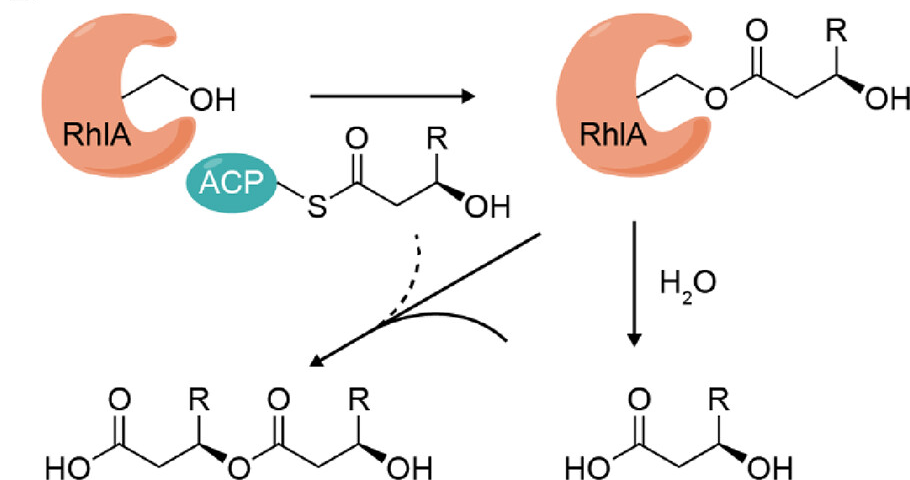 综合应用同位素标记、体外学表征、以及QM/MM计算模拟手段,研究人员验证了RhlA在体外反应中具有硫酸酯酶活性,可以催化酰基-ACP(acyl carrier protein, 酰基载体蛋白)底物水解生成游离3-羟基脂肪酸。同时,团队发现游离3-羟基脂肪酸也可以作为酰基受体,在RhlA酰基转移酶活性的催化作用下与酰基-ACP供体形成HAA,但是该路径在整体反应中的贡献占比较小。