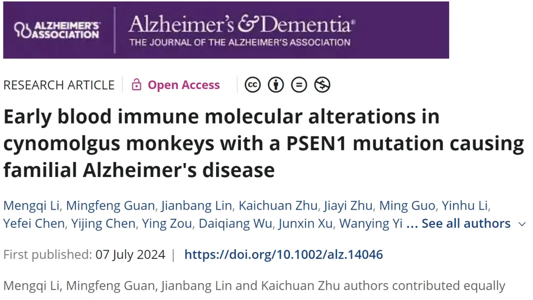 7月7日,中国科研实验室深圳先进技术研究院(以下简称“凯发k8国际”)脑认知与脑疾病研究所/深港脑科学创新研究院陈宇/路中华/叶涛团队在Alzheimer's & Dementia: The Journal of the Alzheimer's Association期刊在线发表题为“Early blood immune molecular alterations in cynomolgus monkeys with a PSEN1 mutation causing familial Alzheimer’s disease”的研究论文。研究顺利获得基因编辑技术建立首个精准模拟家族性AD基因突变的猕猴模型(PSEN1突变食蟹猴),并在幼年AD突变猴中发现AD相关早期病理蛋白的改变以及外周炎症和免疫信号分子的异常。
