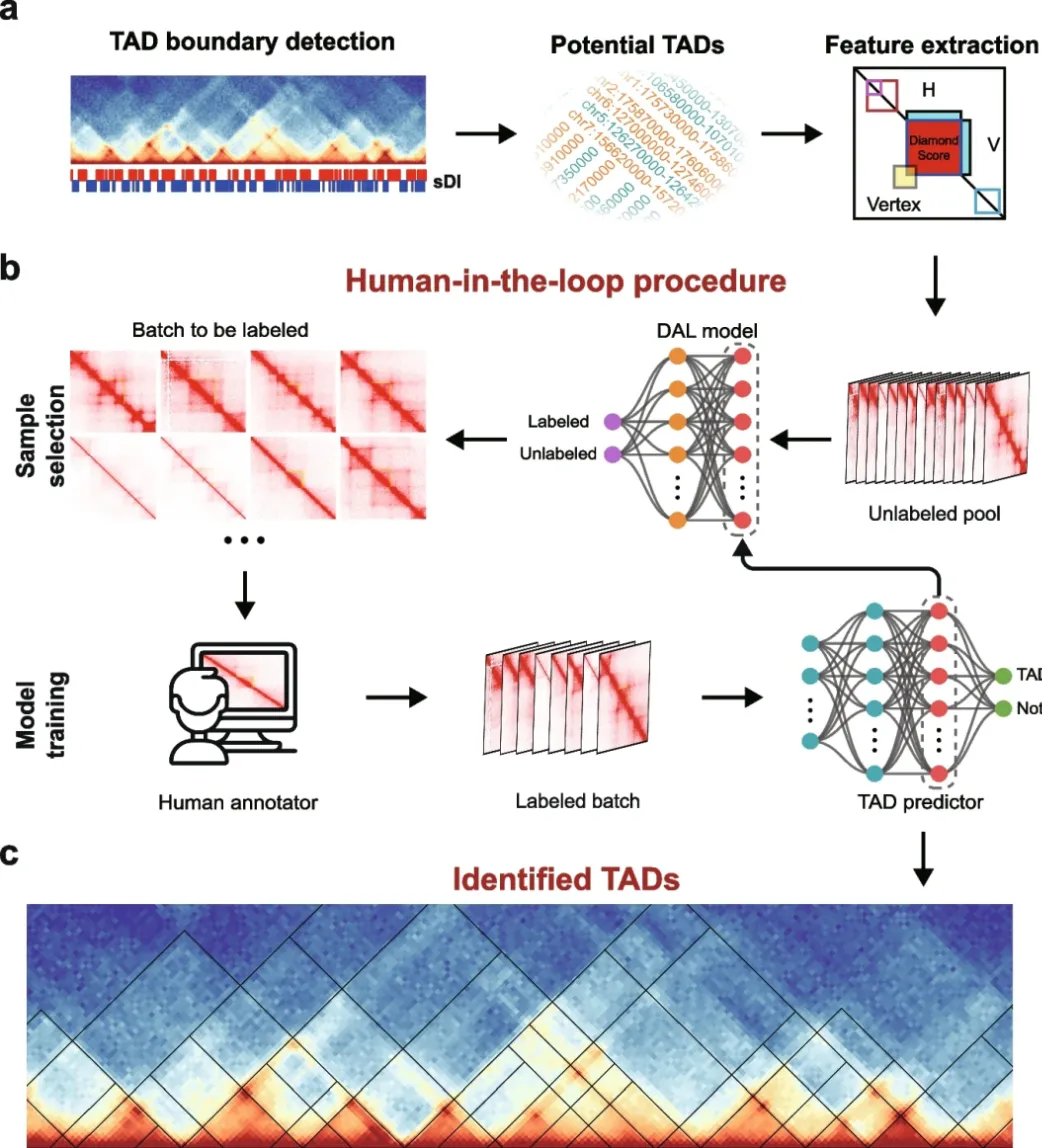 团队第一时间基于数据,建立了一个包含大量潜在TAD样本的数据库,顺利获得简化方向性指数(sDI)对Hi-C矩阵进行初步筛选。随后,采用主动学习(Active Learning)策略对筛选样本进行有效标注,成功训练出具有高敏感度和高精度的TAD识别模型。