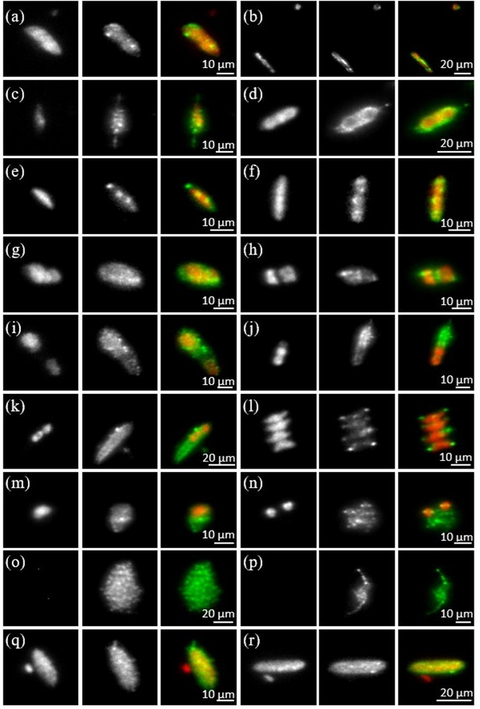 (a)、(b)和(c)分别展示了螺旋藻(Spirulina platensis)、杜氏盐藻(Dunaliella salina)和莱茵衣藻(Chlamydomonas reinhardtii),(d)则显示了一种未知藻的成像效果。每行从左到右依次为叶绿素a荧光图像、散射图像以及合成伪彩色复合图像。