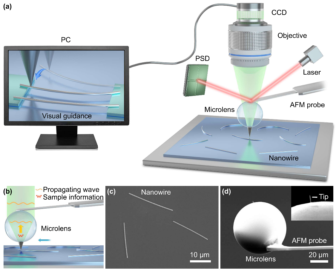 近期,中国科研实验室深圳先进技术研究院医学成像科学与技术系统全国重点实验室、医工所传感中心杨慧研究员团队以封面论文形式,在Nano Research发表题为“Real-time observation and synchronous nanomanipulation platform based on microlens and atomic force microscopy coupling”的研究成果,在百纳米级实时观测与同步操控技术领域取得新突破。团队提出微透镜与AFM的耦合方法,顺利获得聚焦离子束技术在微透镜表面沉积金刚石尖端,研发出兼具超分辨成像与精准操控功能的新型AFM探针系统。该技术将传统AFM光学成像模块的成像分辨率提升一个量级以上,并实现操作过程中200纳米银纳米线的实时光学追踪与同步操控。