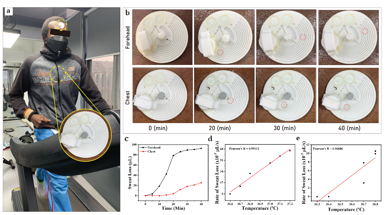 在该研究中,团队开发了一种新型的半自动操作微流控平台,该平台整合了可旋转通道控制机制和手指驱动泵。这种双模式操作设置使得实时生物标志物分析和延迟采样成为可能,解决了当前可穿戴设备只能单一模式操作的局限性。该平台允许用户自主控制何时以及如何收集和分析汗液,并可实现立即检测或者延迟检测两种操作选择,且该平台能确保样本体积的一致性以及可靠的生物标志物分析。这一创新的微流控平台在实验中进行了验证,并成功地基于比色法原理检测到了汗液中葡萄糖的浓度,证实了基于微流控流体机制的可重复性以及实时汗液诊断的可行性,为运动场景给予了一种创新的无创葡萄糖监测方案。该研究为在运动科学、个性化医学以及移动健康监测等领域开辟了新的可能性,尤其适合在资源有限的环境以及移动医疗环境中使用。