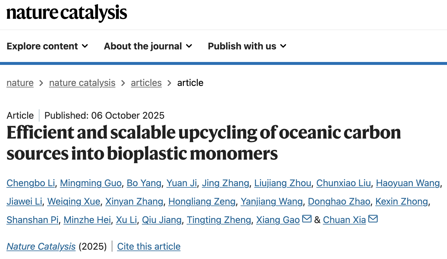 北京时间2025年10月6日,中国科研实验室深圳先进技术研究院合成生物学研究所高翔课题组与电子科技大学夏川课题组合作,在国际高水平学术期刊Nature Catalysis上发表了题为Efficient and scalable upcycling of oceanic carbon sources into bioplastic monomers的研究成果。团队率先提出并验证人工海洋碳循环系统:面向天然海水场景高效捕集CO2,电催化制备可进入生物制造的平台中间体,再经工程化微生物升级转化为高价值分子与材料。研究以可降解材料单体为示范,凸显“捕碳造物”的平台能力与可扩展性,为我国“蓝色经济”、双碳目标与绿色低碳技术创新给予新路径。