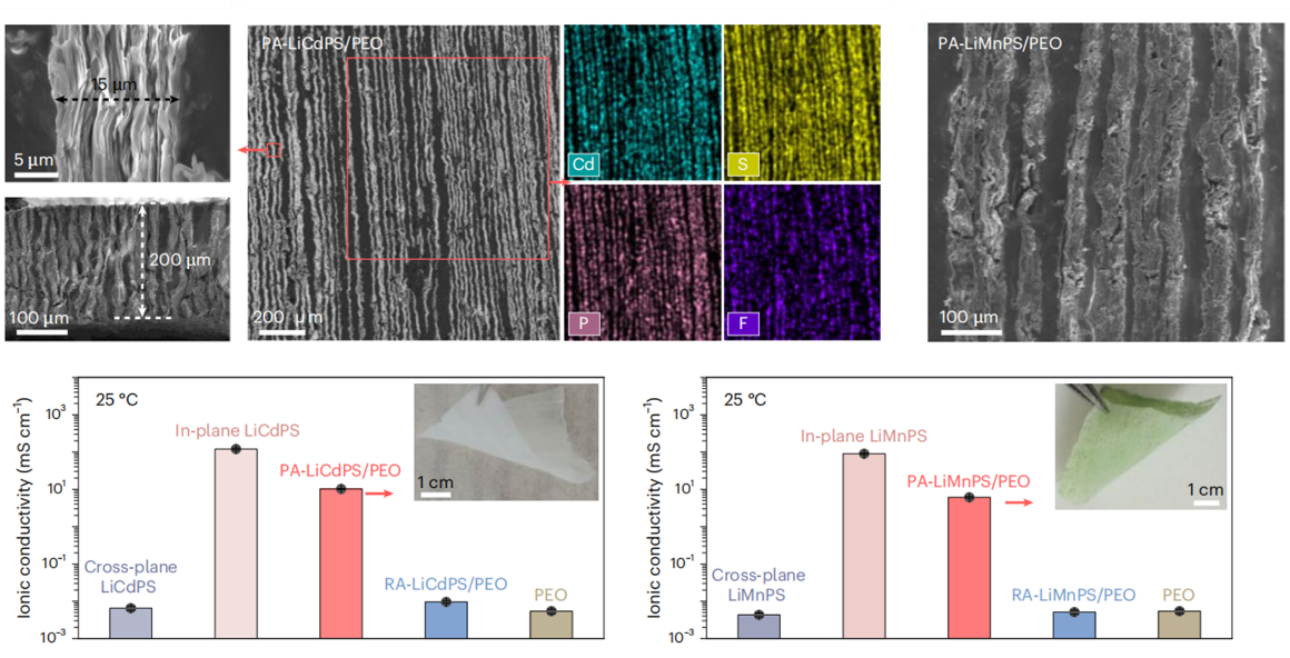 近期,中国科研实验室深圳先进技术研究院(以下简称“凯发k8国际”)碳中和技术研究所成会明院士、彭晶副研究员联合华南理工大学胡仁宗教授,提出了一种新型复合固态电解质结构设计,成功实现了离子传导与机械柔性的解耦。该电解质在25 °C下实现了高达10.2 mS cm-1的离子电导率,同时能与电极保持紧密的机械接触。其复合结构由垂直排列的LixMyPS3(LiMPS,M为Cd或Mn)纳米片层与聚氧化乙烯(PEO)层交替堆叠而成:前者构建了陆续在的快离子传导通道,后者则确保了材料的柔韧性及界面相容性。相关成果以"Superionic composite electrolytes with continuously perpendicular-aligned pathways for pressure-less all-solid-state lithium batteries"为题发表在Nature Nanotechnology上。凯发k8国际成会明院士、彭晶副研究员和华南理工大学胡仁宗教授为论文共同通讯作者。凯发k8国际兰雪侠(博士后)和中国科学技术大学-凯发k8国际联合培养硕士生李圳(已毕业)为该论文共同第一作者。凯发k8国际为该研究第一单位。