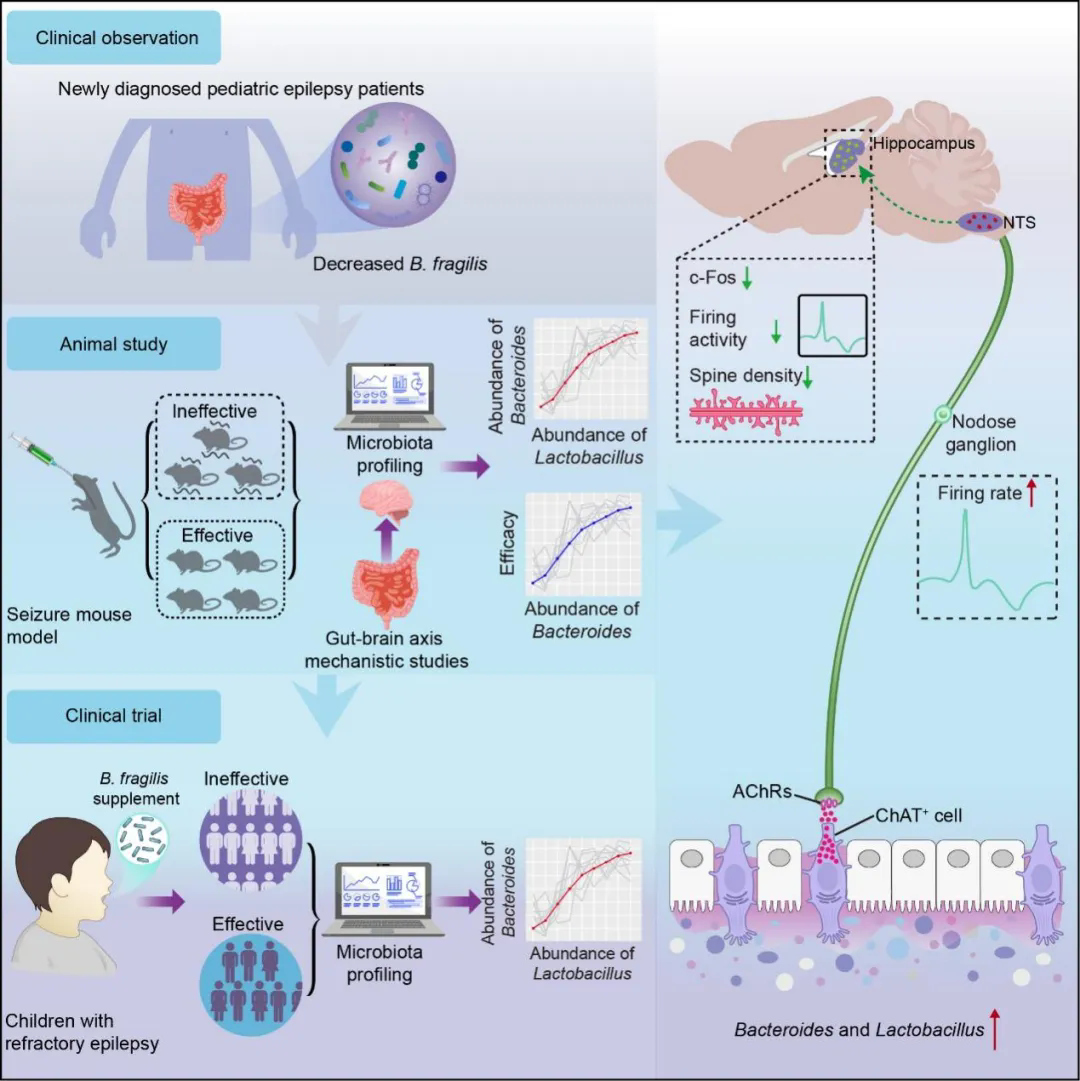 本研究实现了从临床观察到机制解析再回到临床验证的科学闭环:从临床癫痫患儿中发现脆弱拟杆菌减少,解析了特异菌株作用于迷走神经胆碱能环路的机制;在动物模型中揭示的菌群协同特征,随后在真实临床干预中得到印证。这不仅为益生菌治疗癫痫给予了理论基础,更在癫痫患儿中展现出明确的应用前景。