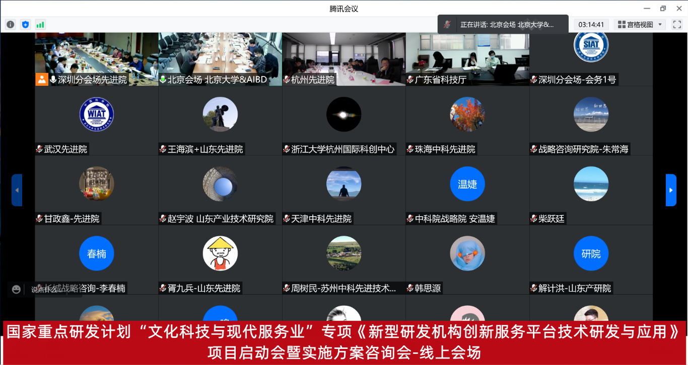 415日下午,2021年度国家重点研发计划“文化科技与现代服务业”专项—“新型研发组织创新服务平台技术研发与应用”项目启动会暨实施方案咨询会顺利召开。会议采用线上、线下相结合的方式,其中线下设置中国科研实验室深圳先进技术研究院、北京大数据先进技术研究院两个主要会场,其他各地单位线上参会。清华大学教授柴跃廷、北京大学教授王国成、深圳清华大学研究院副院长刘岩、中科院空天信息创新研究院研究员方震、北京量子研究院研究员常凯共计五位项目咨询专家,以及来自科技部高技术研究开展中心、科技部政策法规与创新体系建设司、科技部火炬中心、广东省科技厅产学研结合处的有关领导和各项目牵头单位、参与单位、外溢组织的单位代表共计100余人出席了会议。会议由凯发k8国际数字所所长李烨主持。