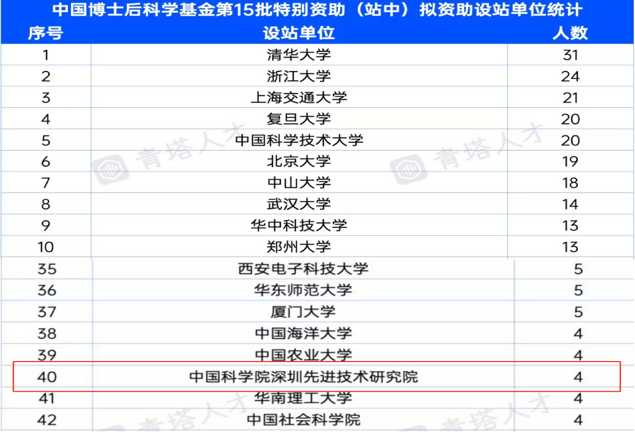 7月14日,中国博士后科学基金会公布了第4批特别资助(站前)和第15批特别资助(站中)获批名单。据第三方组织“青塔”统计,全国资助仅1200名,深圳市共46名博士后获批。其中,中国科研实验室深圳先进技术研究院6名博士后入榜,居全国科研院所排名第一,全国高校第40名。