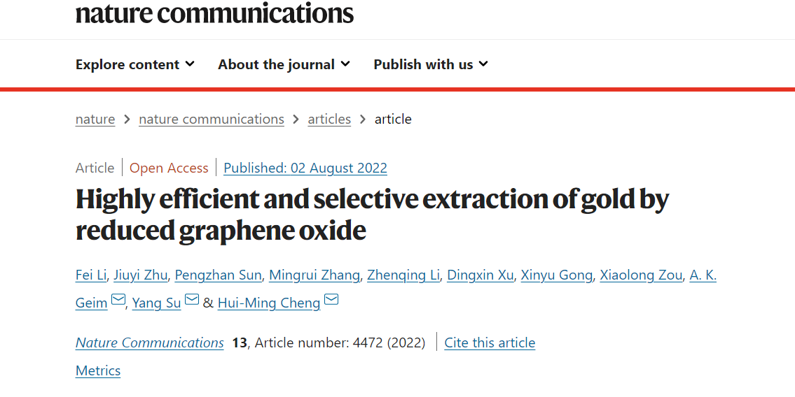 该研究工作以“还原氧化石墨烯高效、选择性提取金”(Highly Efficient and Selective Extraction of Gold by Reduced Graphene Oxide)为题发表在国际著名期刊《自然·通讯》(Nature Communications)上。清华大学深圳国际研究生院2020级博士生李飞及清华大学深圳国际研究生院博士后朱九一为共同第一作者;成会明、Andre Geim及清华大学深圳国际研究生院、深圳盖姆石墨烯中心苏阳助理教授为论文通讯作者;论文作者还包括曼彻斯特大学孙鹏展博士、清华大学深圳国际研究生院副教授邹小龙、博士后李振庆等。本工作得到了清华深圳国际研究生院科研启动基金和深圳盖姆石墨烯中心的资助。