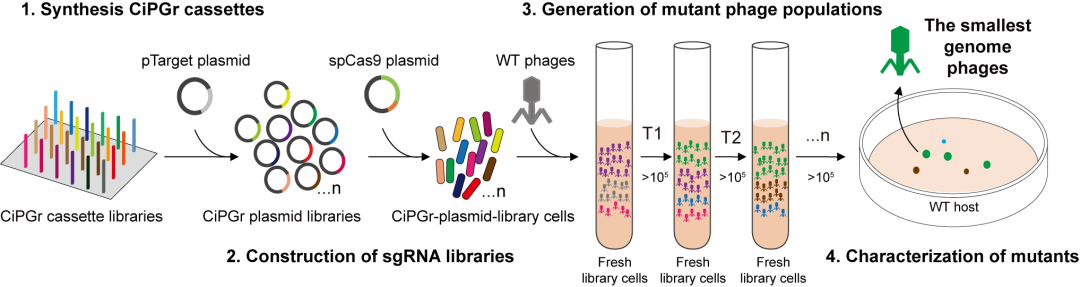 基于这个启发,团队开发了一种自上而下的全基因组简化方法,称为基于CRISPR-Cas9的迭代噬菌体基因组简化方法(CRISPR/Cas9-based iterative phage genome reduction, CiPGr)。针对所有目标基因,设计不同的CRISPR系统,并在DNA芯片上合成,制备出删除噬菌体不同基因的CRISPR细菌文库。在CiPGr过程中,用一群噬菌体侵染细菌文库,使不同的噬菌体删除不同的基因,形成一个噬菌体突变文库。如果被删除的基因对噬菌体扩增不是必需的,则突变噬菌体后代可以继续侵染新的细菌。噬菌体突变文库不断转接到新鲜培养的细菌文库中,使得基因缺失在噬菌体基因组中不断积累,而具有生长优势的基因组简化噬菌体将在种群中占主导地位,最终被富集并更可能被分离纯化出来(图2)。