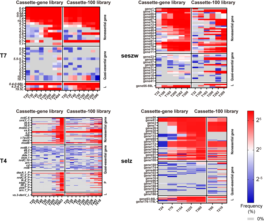 在对CiPGr生成的单克隆突变噬菌体进行测序时,科研团队观察到基因缺失数量随着转接次数的增加而在单克隆突变噬菌体基因组中不断积累。CiPGr应用于四种不同的有尾噬菌体(模式噬菌体T7和T4;沙门氏菌噬菌体seszw和selz),导致这些噬菌体的突变体删除8-23%(3.3-35 kbp)的序列,产生了最简底盘噬菌体。持续的转接过程使具有较大生长优势的突变株将在突变库中占主导地位,并在众多突变株中有更大概率进入下一轮转接过程。因此,单克隆突变噬菌体基因组中基因删除的顺序可能表明这些基因在噬菌体扩增中的重要性顺序,即基因越早被删除,该基因对噬菌体扩增就越不重要(图5)。