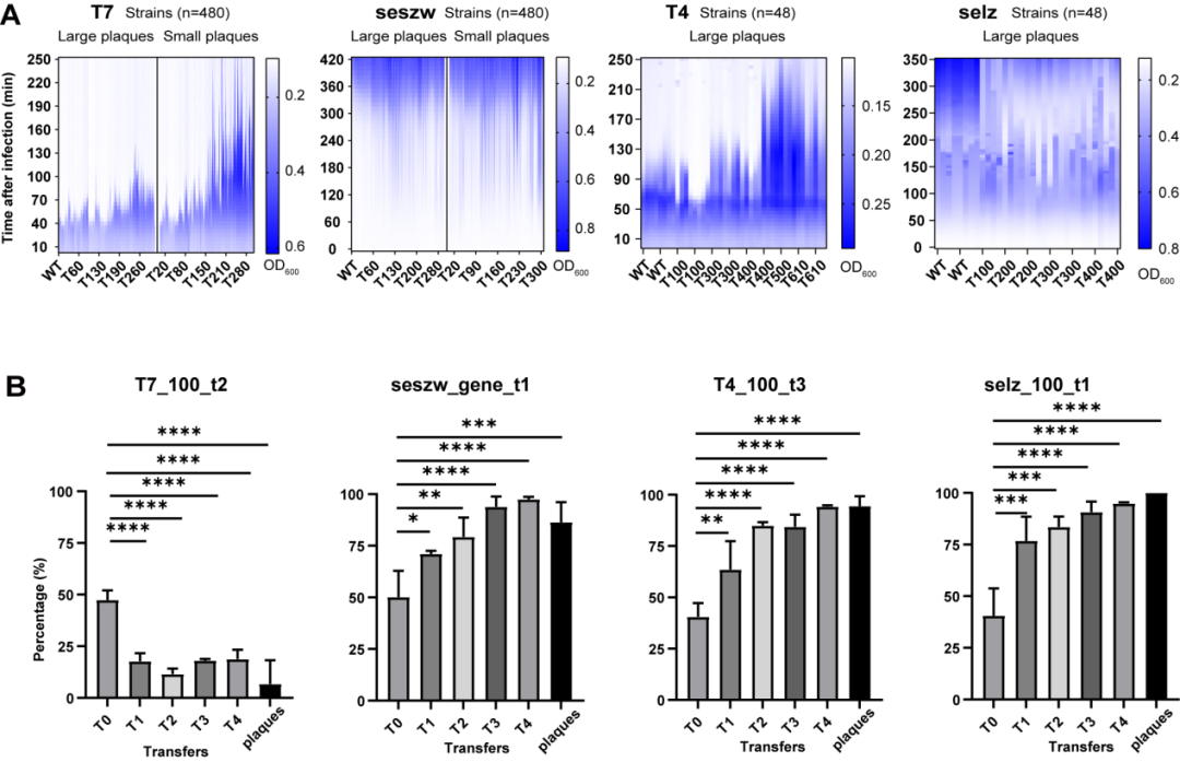 在对突变噬菌体的表型进行鉴定时,团队发现部分突变株的抑菌或杀菌能力比野生型强,因此,科研人员设计了实验对这些更强杀菌能力的突变株进行分离与鉴定,并将取得的噬菌体突变文库与野生型宿主菌混合在一起进行培养。经过8次陆续在转接后,具有较高侵染效率的突变株能产生更多子代,使其在种群中占主导地位,从而分离出强杀菌能力的简化基因组噬菌体。其中T4、seszw和selz的杀死同样数量细菌的时间比野生型减少了一半以上(图4),由此说明顺利获得基因组简化可以取得比野生型噬菌体裂解能力更强突变株的可行性。