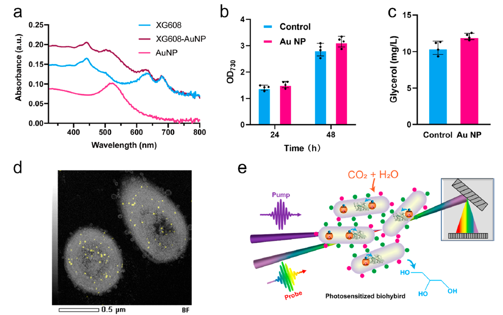 1. 金纳米颗粒-蓝细菌杂合体提高光能驱动CO2固定合成甘油的效率