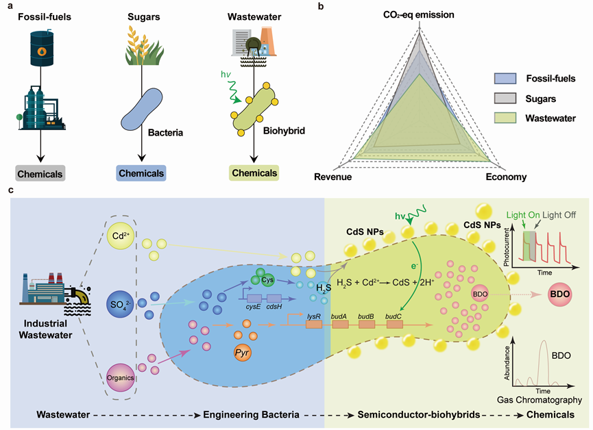 可持续开展路线是人类社会生存和开展的根本,但化工制造主要依赖于化石燃料,并持续释放CO2,环境不友好且不可持续;生物制造为化学品合成给予了一条可持续开展路线,传统糖基生物发酵生成还原力(NADH等)的过程会同时释放CO2,从而降低了化学产品的碳转化率;光能是充足的清洁能源,半导体材料-生物杂合体是将高效吸收光能的半导体与细胞工厂结合,可以直接利用光能为细胞工厂给予还原力,因此,光驱动杂合体生产化学品具有更高的理论碳转化率,在绿色生物制造领域体现出独特优势和较大的潜力,但现在缺乏低成本、环境友好型的方法规模化合成杂合体。