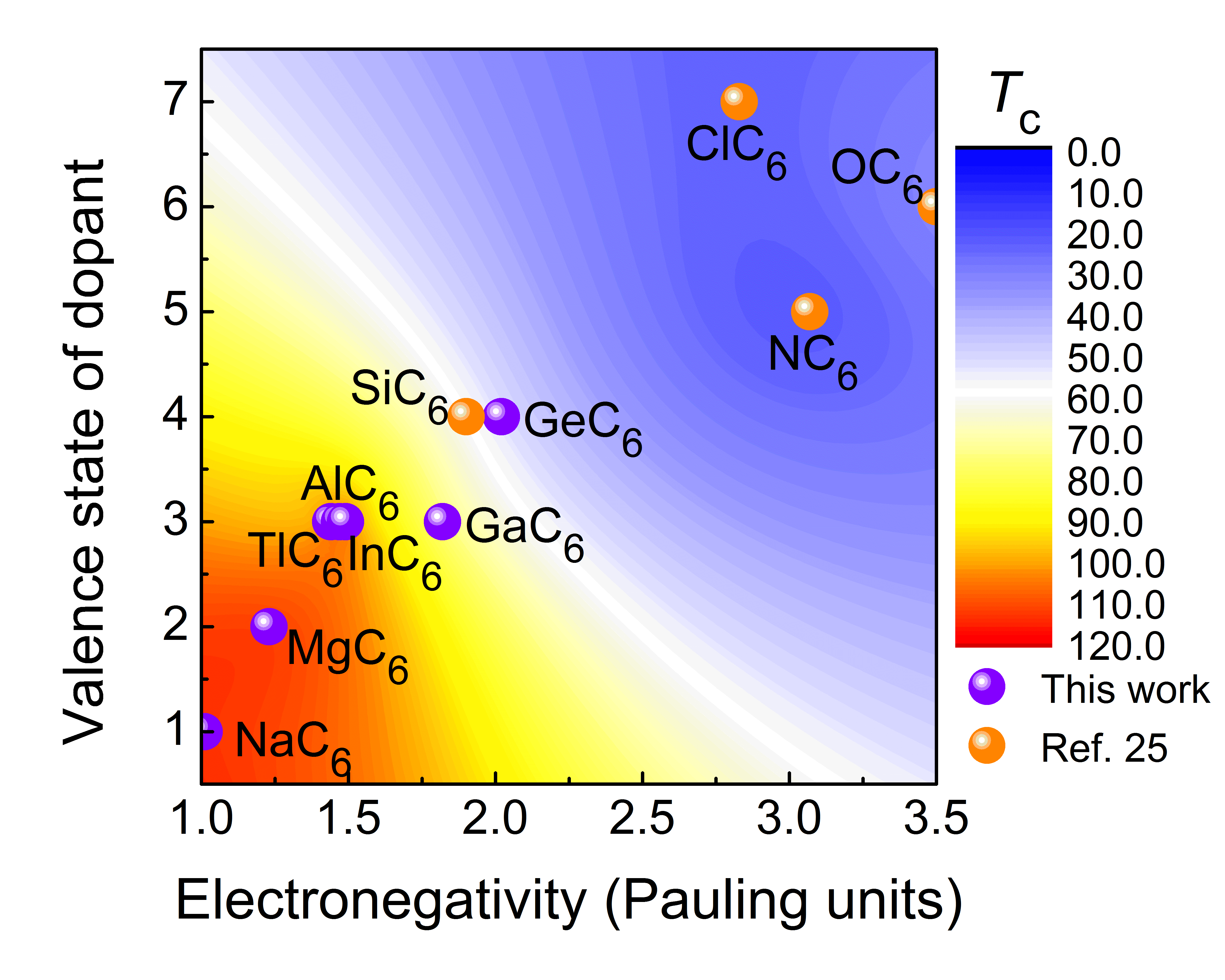 图3. 其他元素掺杂C24笼后,超导转变温度与掺杂元素电负性和价态的关系。