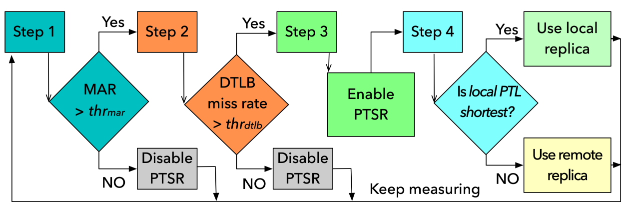 本研究是首个研究并实现页表自复制自动化的方法。我们对程序的特性和系统中程序混部对程序取得页表复制收益的影响进行分析,提出了两项创新技术。第一时间,我们确定了一组关键指标,这些指标在大多数处理器架构上都可取得,并可用于指示是否应启用/禁用页表复制。其次,基于这些指标我们设计了一种分层和渐进的机制,以自动启用/禁用特定程序的页表复制,从而提高该程序的性能。