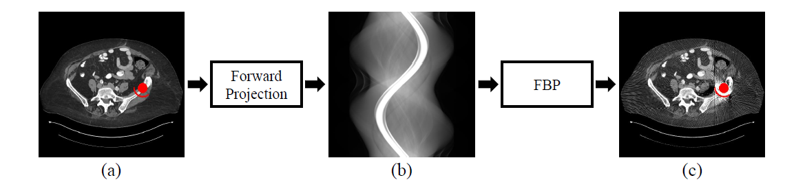 1. (a)表示病人体内的金属植入物;(b)表示被金属影响的CT正弦图;(c)表示有着严重金属伪影的重建图像。