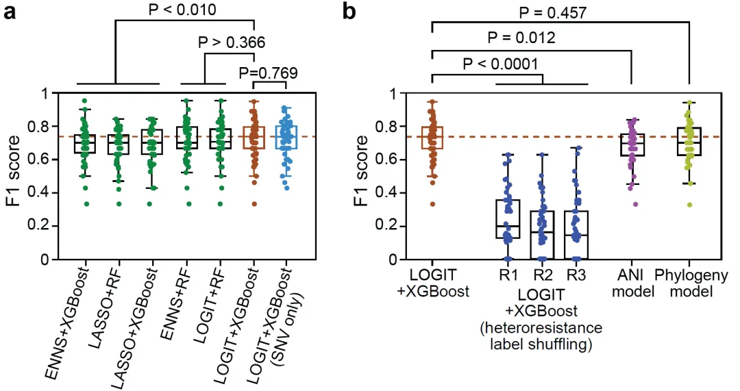 为了精确表征近平滑念珠菌的基因组特征(genomic feature)并分析其与异质性耐药表型的相关性,本文共同第一作者廖辰博士开发了基于开放阅读框(ORF)完整性和拷贝数的双参数拷贝数变异(CNV)表征法。顺利获得整合219株临床菌株的药敏表型与SNV/CNV信息,作者构建了一个基于不超过10个基因组特征预测异质性耐药表型的机器学习模型算法,并进行了概念验证,为未来开发可应用于临床的异质性耐药快速检测法给予了基础。