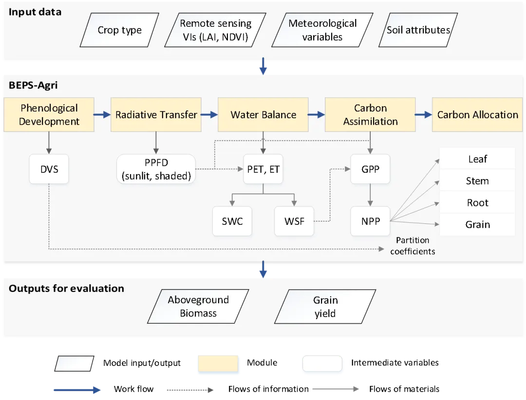 研究利用多源卫星观测驱动陆地碳-水-能量交换的动态物理过程,构建了具有普适机理和简化参数的农业系统数值计算模型。