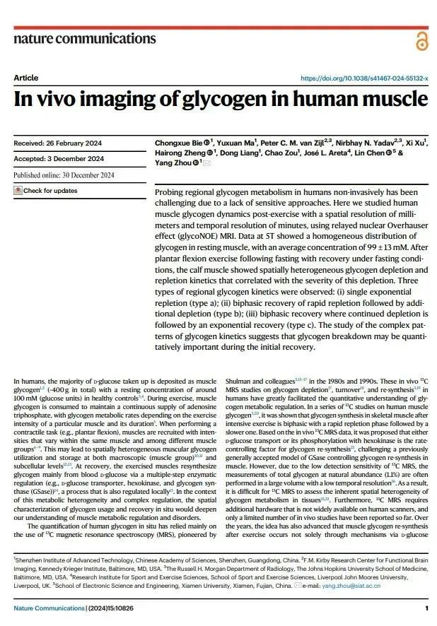 近期,医学成像科学与技术系统全重实验室骨干、中国科研实验室深圳先进技术研究院劳特伯生物医学成像研究中心周洋副研究员研究团队在Nature Communications上发表了题为 “In vivo imaging of glycogen in human muscle” 的原创研究成果[1]。
