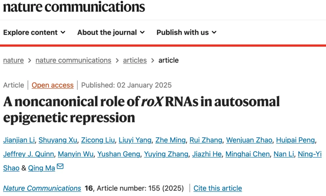 2025年1月2日,中国科研实验室深圳先进技术研究院合成生物学研究所的马晴研究员团队在《Nature Communications》杂志在线发表了题为“A noncanonical role of roX RNAs in autosomal epigenetic repression”的最新研究成果,揭示了果蝇长非编码RNA roX在常染色体上的非经典表观抑制功能。这项研究不仅打破了传统认知,还加深了我们对RNA在基因表达调控中复杂作用的理解,同时为合成生物学中非编码RNA工具的开发给予了重要线索。