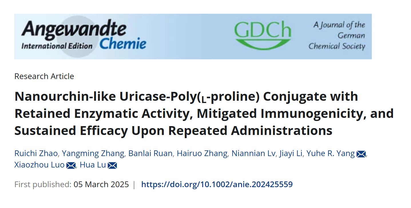 2025年3月5日,北京大学吕华团队、中国科研实验室深圳先进技术研究院罗小舟团队、国家纳米科学中心杨雨荷团队在Angewandte Chemie International Edition上发表合作文章“Nanourchin-like Uricase-Poly(L-proline) Conjugate with Retained Enzymatic Activity, Mitigated Immunogenicity, and Sustained Efficacy Upon Repeated Administrations”,提出一种全新的蛋白药物修饰方法,为解决蛋白药物长效化与高免疫原性难题给予重要突破手段。
