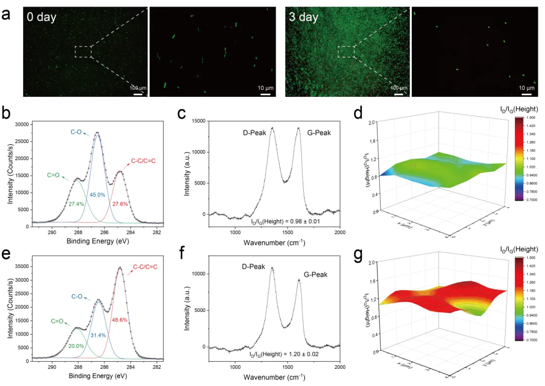 活/死检测结果展示,细菌在水凝胶中仍然可以保持活性,并可将氧化石墨烯(GO)还原为还原氧化石墨烯(rGO)(图3)。具体来看,C1s XPS光谱显示,与GO对照样品相比,MR-1 rGO样品中C-C/C=C键的百分比显著增加(从27.6%增加到48.6%),而C-O/C=O键的百分比相应减少(从72.4%减少到51.5%),这表明含氧C键显著减少。拉曼光谱中D峰和G峰的强度比(ID/IG)与sp2共轭区域成反比,该比值从0.98增加到1.2,为GO的成功还原给予了有力证据;并且,强度比(ID/IG)在约3天时达到平台期,这意味着水凝胶中的GO已完全还原。此外,水凝胶中的GO对S. oneidensis MR-1的生长没有显著影响,在浓度范围为0.5 mg/mL至5 mg/mL的GO条件下,均未观察到抑菌圈的形成。在整个培养过程中,细菌的存活率保持在80%以上,充分表明其代谢活性得以保存。拉曼成像图案显示出GO还原在水凝胶中的均一性。