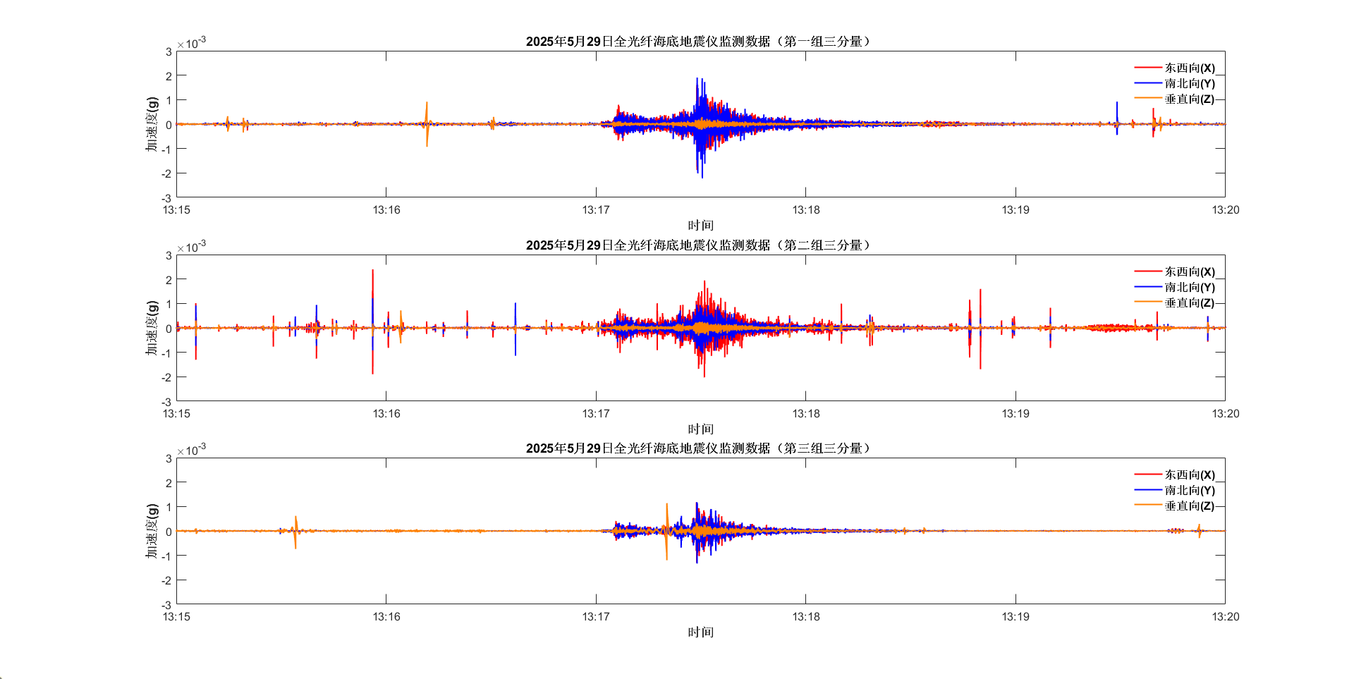 据中国地震台网正式发布,2025年5月29日13时17分,在广东河源市源城区发生3.5级地震,震源深度11公里,震中位于北纬23.71度,东经114.69度。此次地震亦被上述监测网络的三组、三分量全光纤地震仪即时测到。该三组三分量全光纤海底地震仪虽处于浅海复杂环境中,但依然能监测到较弱地震;且具有机电式海底地震仪无法媲美的海底全光纤无源、不受电磁干扰、数据实时传输、布放简单且易复用组网等独特优势。