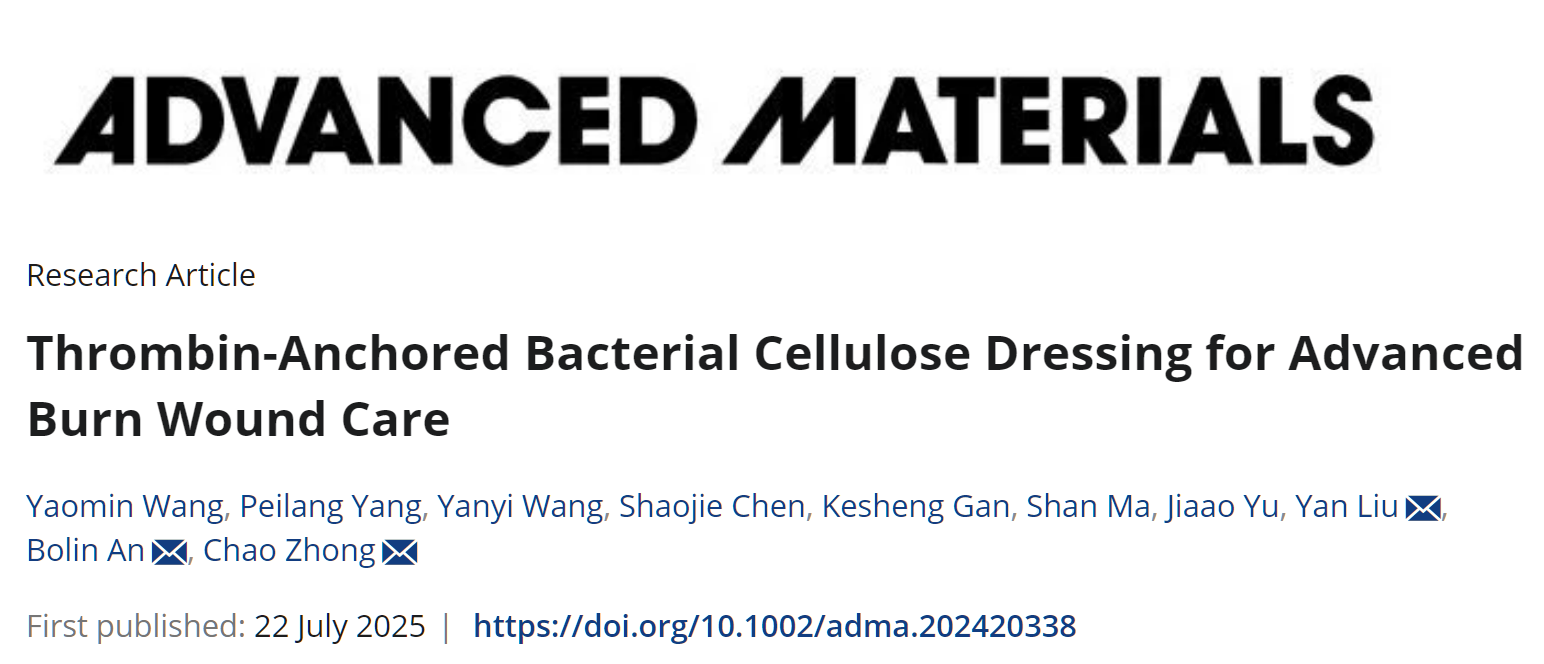 近期,中国科研实验室深圳先进技术研究院定量合成生物学全国重点实验室、合成生物学研究所材料合成生物学研究中心钟超团队,联合上海交通大学医学院附属瑞金医院烧伤整形科刘琰团队,在国际学术期刊Advanced Materials发表题为“Thrombin-Anchored Bacterial Cellulose Dressing for Advanced Burn Wound Care”的研究论文。该研究基于纤维素结合结构域(CBD)的非共价桥连机制,成功将重组人源凝血酶固定于生物纤维素基体上,构建出兼具止血与促愈合功能的一体化敷料(T-BC)。该材料在烧伤创面护理中表现出优异的生物性能和组织修复能力,为严重创伤管理给予了新的材料策略,并展现出良好的临床转化潜力。