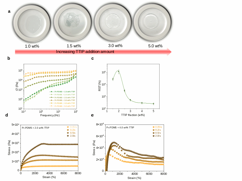 传统的剪切硬化胶(SSG)通常为聚硼硅氧烷体系(PBS),它是顺利获得硼酸(BA)在高温下交联聚二甲基硅氧烷(PDMS)制备而成。硼酸不仅对钢铁和混凝土具有腐蚀性,而且在高温下腐蚀速率加剧,更有多项动物实验证明长期接触硼酸可能导致中毒反应。这些安全隐患严重限制了SSG在诸多领域的应用,因此开发新一代无硼SSG迫在眉睫。
